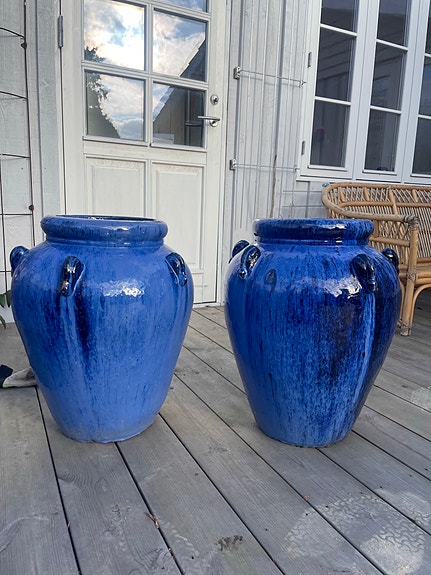 Blå glaserede krukker