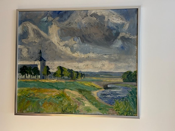 Landskabsmaleri med kirke og flod