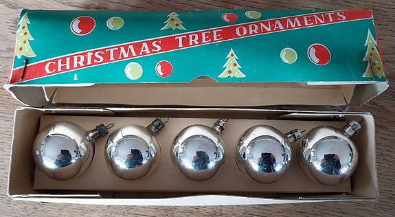 Gamle julekugler i æske