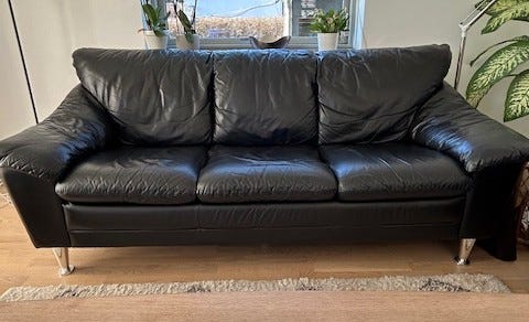 Syver stol 3107, nypolstret i cognac semianilin læder. Med armlæn og sort stel