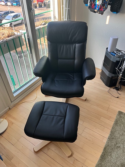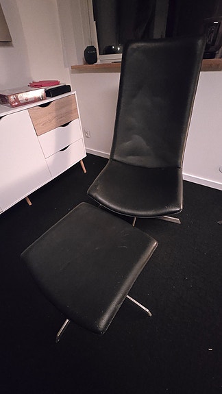 Sort læderstol med skammel