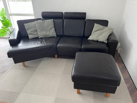 Lækker mørkebrun lædersofa med puf