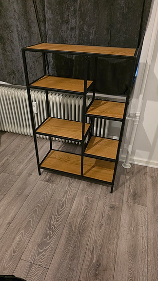 Reol sortmetal med træhylder