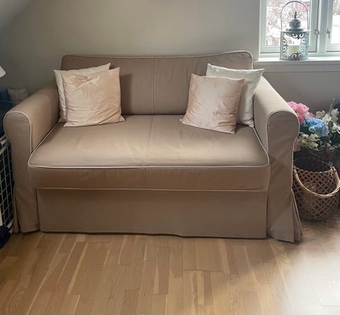 Beige sovesofa med opbevaring
