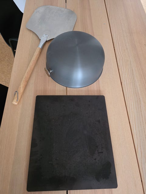 Pizzaspade, bagestål og pizzadome.
