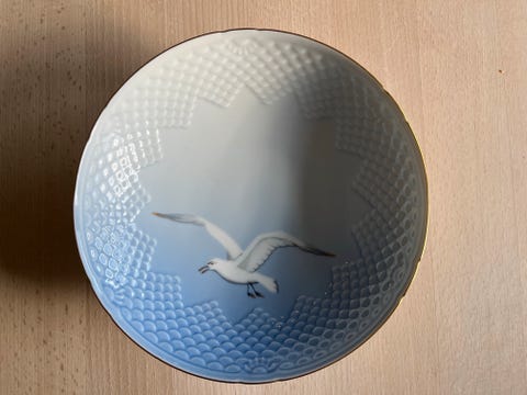 Mågestel med guldkant – 12 kaffekopper med underkop, fade, sukkerskål,flødekande