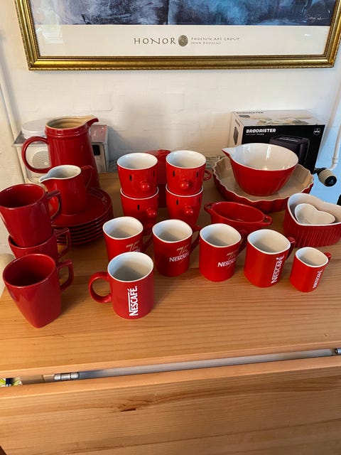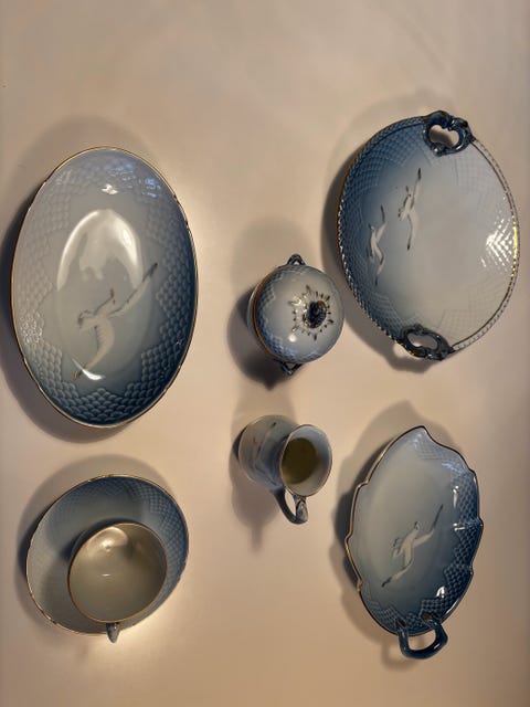 Mågestel med guldkant – 12 kaffekopper med underkop, fade, sukkerskål,flødekande