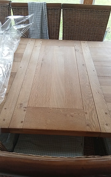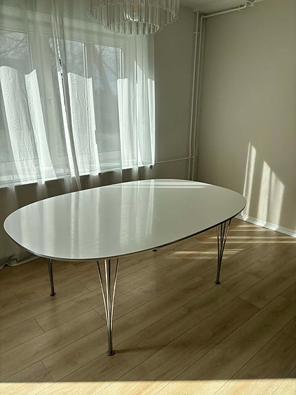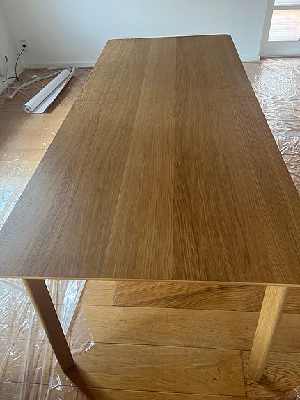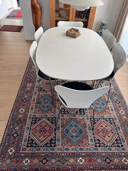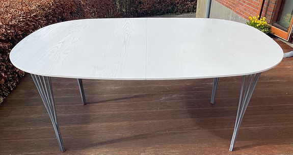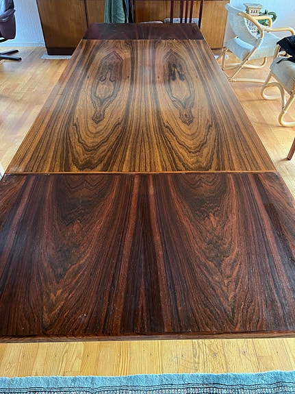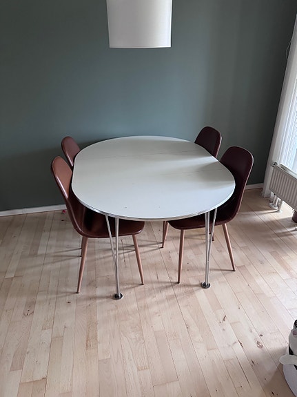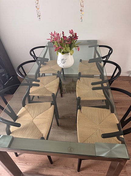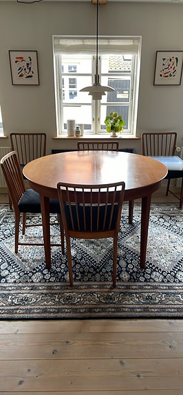 Carl Hansen spisebord med 2 tillægsplader og Hans J. Wegner y-stole i bøgetræ.