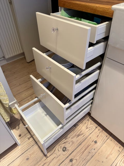 Du kan spare på udgifterne ved at købe en del af møblerne brugt – for eksempel køkkenskabslåger, skilleplader eller bordplader. Samtidig bør du tænke over, om en totalrenovering af køkkenet er nødvendig, eller om det vil være nok at få nye køkkenlåger til gamle skabe. Overvejer du at købe brugte køkkenmøbler, skal du være opmærksom på dimensionerne, materialet og møblernes stand.