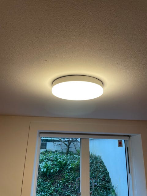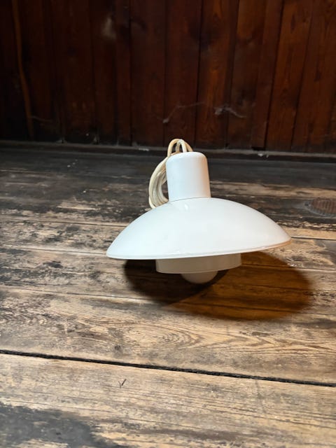 Loftlampe i hård hvid plast.
