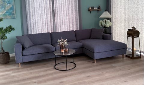 Blå sofa i stof med chaiselong