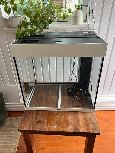 Akvarium med låg og tilbehør