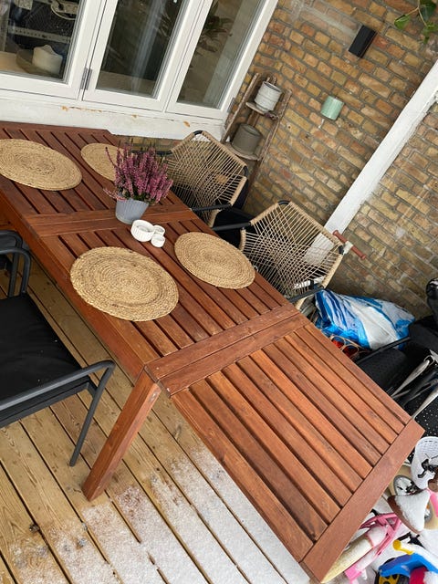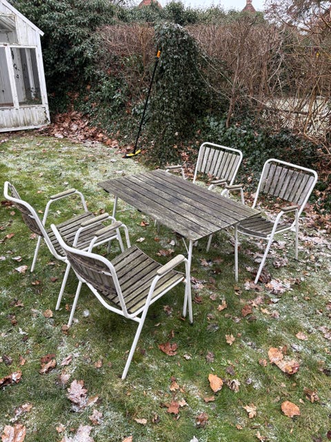 Havebord med seks stole.