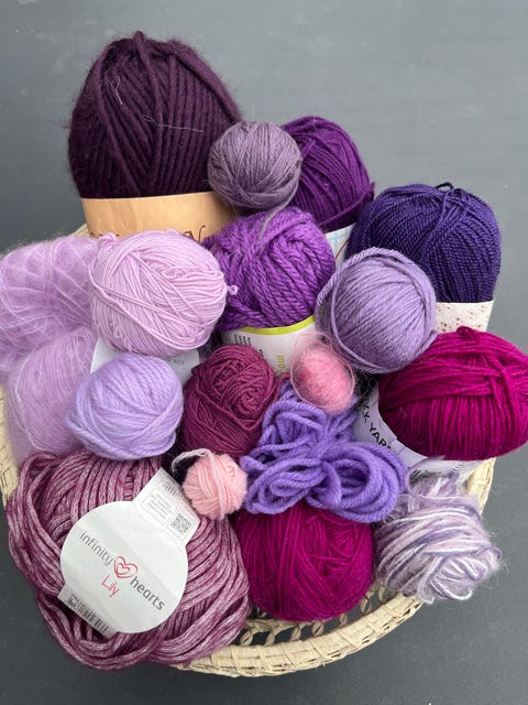 Ti garnnøgler i lilla