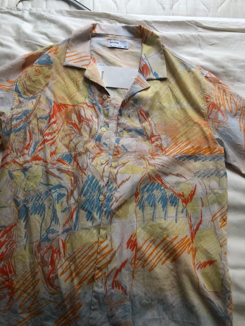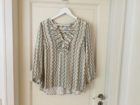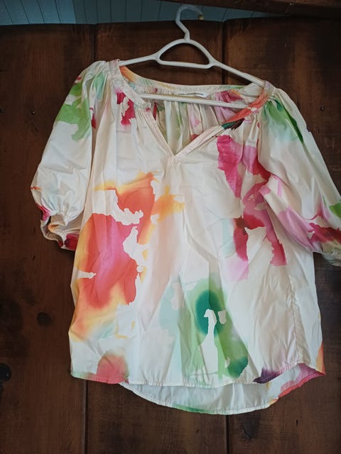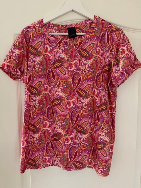Ny Flot MADS NØRGAARD bluse i blå og hvid med kort ærme, fleksibel stof, str. L.