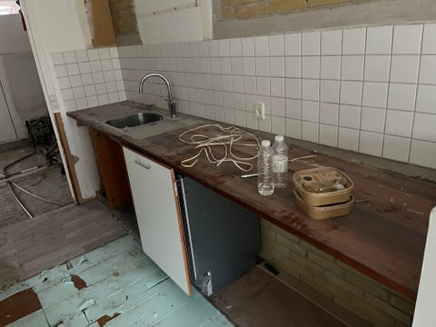 Køkkenbord med vask og køleskab