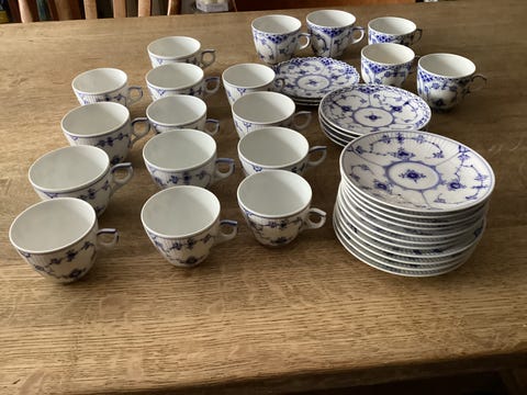 Porcelæn, Kaffekop med kagetallerken, Royal Copenhagen Musselmalet Halvblonde