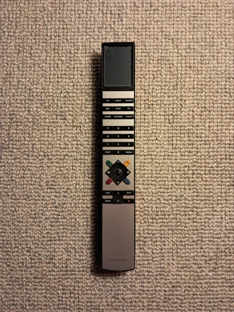 Beogram 5005 pladespiller med radio, højtalere, kontrolpanel, og fjernbetjening