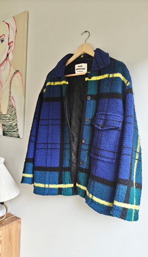 Ny Flot MADS NØRGAARD bluse i blå og hvid med kort ærme, fleksibel stof, str. L.