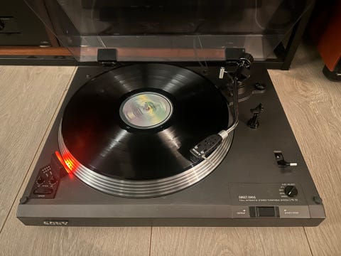 Beogram 5005 pladespiller med radio, højtalere, kontrolpanel, og fjernbetjening