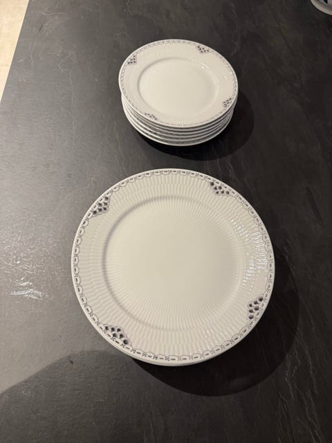 Royal Copenhagen porcelænssæt skåle kande fade og vase hvid med blå dekoration