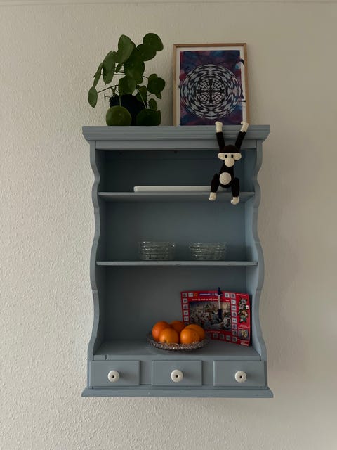 Fin lyseblå væg reol
