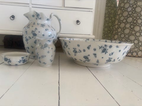 hvid med blå blomstermønster