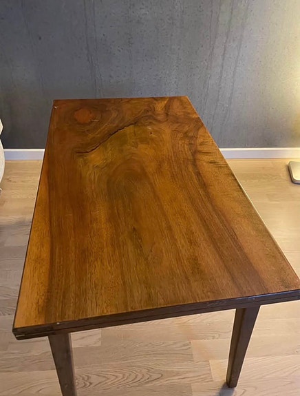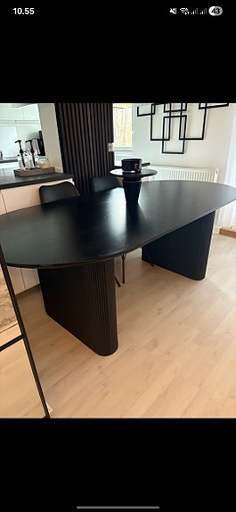 Fritz Hansen Arne Jacobsen stol træ med sort lædder hyndesæde og rund spisebord