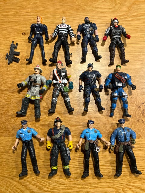 Figur, biler og helikopter.