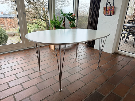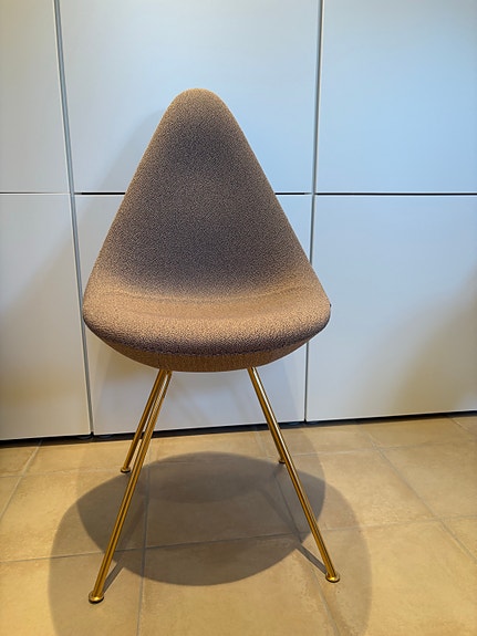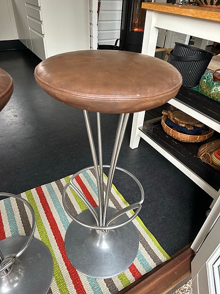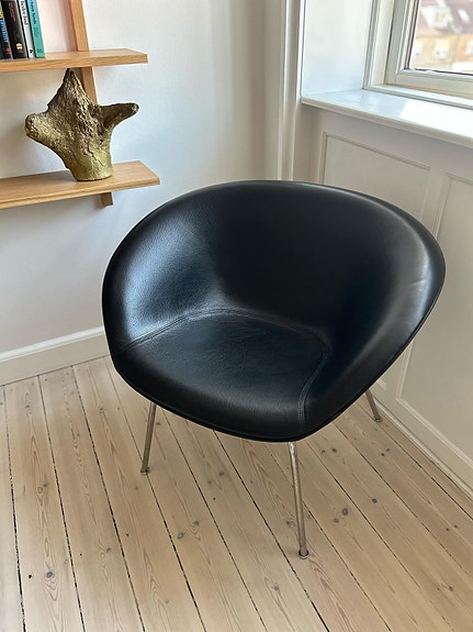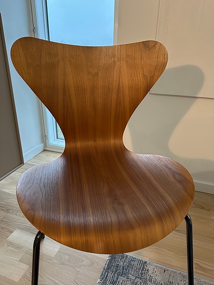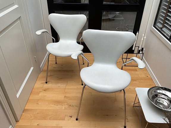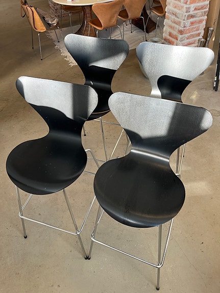 6 stk syver stole 3107, nypolstret i cognac semianilin læder. Sædehøjde 44,5 cm.
