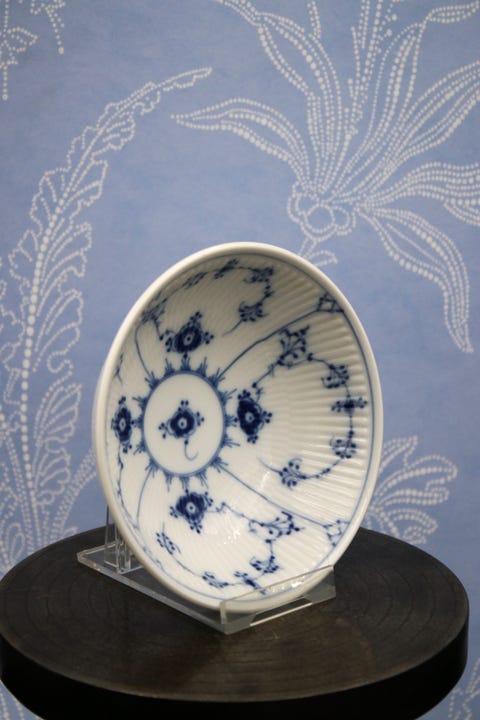 Lille dyb tallerken i Musselmalet, Riflet med tyk kant fra Royal Copenhagen.