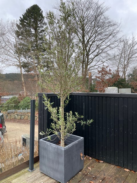 Oliventræ i grå plantekasse