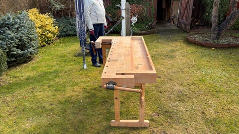 Træ arbejdsbord med skruestik