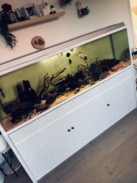 Akvarium med hvidt kabinet