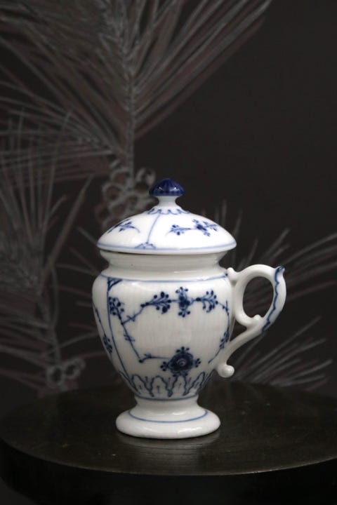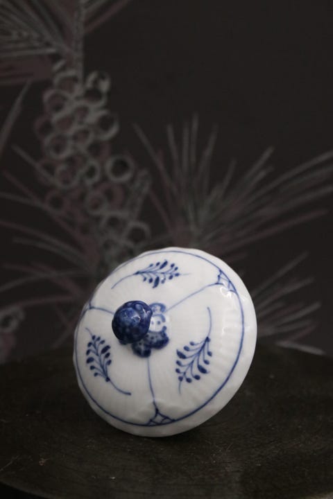 Royal Copenhagen Musselmalet Riflet sennepskrukke med låg og hank. RC# 1/138.