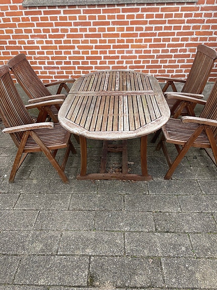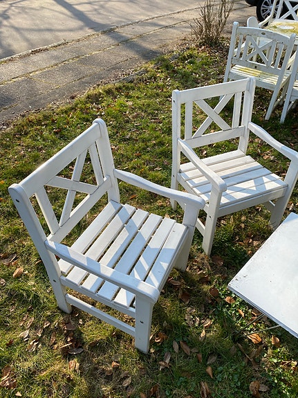 Cafébord og to stole i træ.