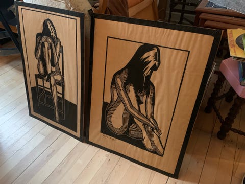 Linoleum prints red & blue
