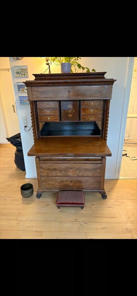 Antik sekretær i træ med skuffer