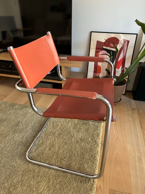 Syver stol 3107, nypolstret i cognac semianilin læder. Med armlæn og sort stel