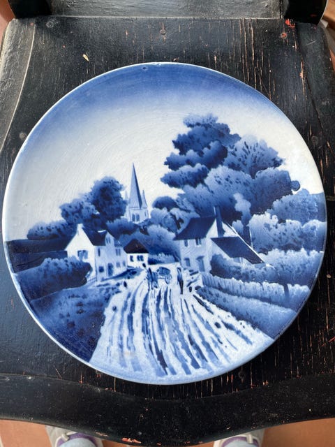 Blå platte med motiv af en by