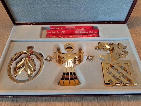 Trio-æske Georg Jensen juleuro 1988 Kristjørn 1989 Engel 1990 Julekurv + andre