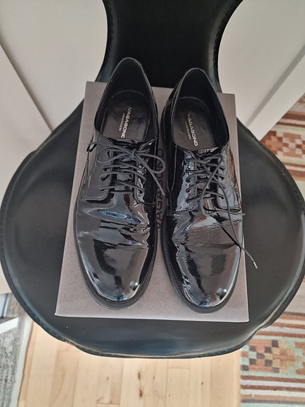 Mørkebrun lakeret reol.