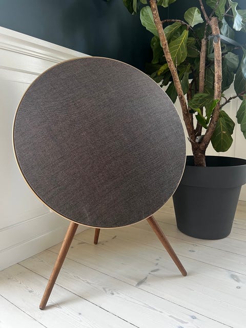 Beoplay A9 MK2 (2. generation) i sort kabinet med brun frontstof og valnødsben
