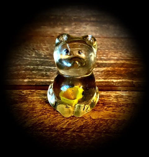 Blå bamse i glas.