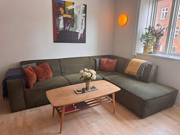 Sovesofa med chaiselong og magasin
