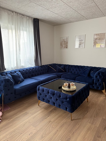 Hjørnesofa med puf blå velour