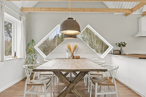 Carl Hansen spisebord med 2 tillægsplader og Hans J. Wegner y-stole i bøgetræ.