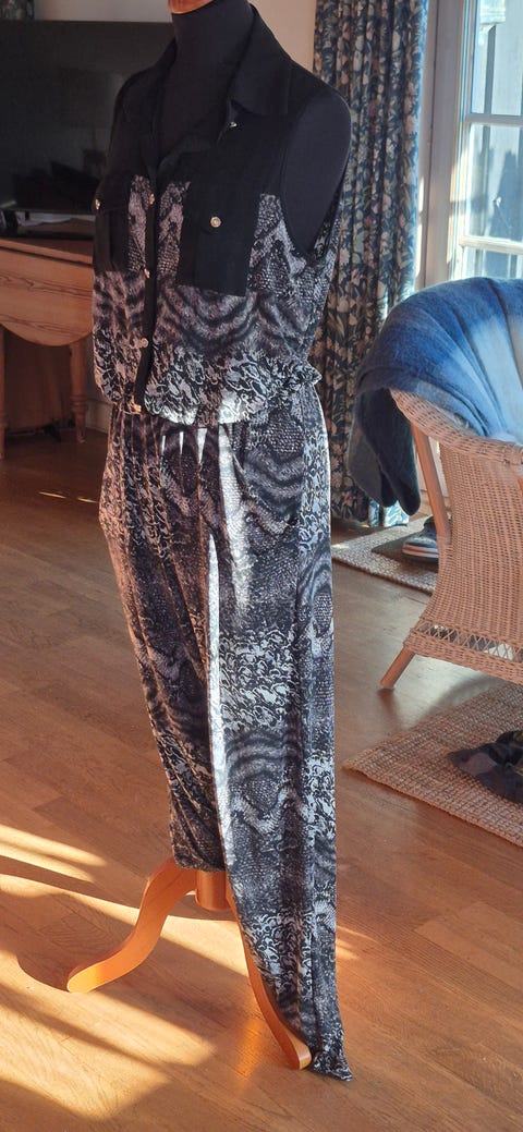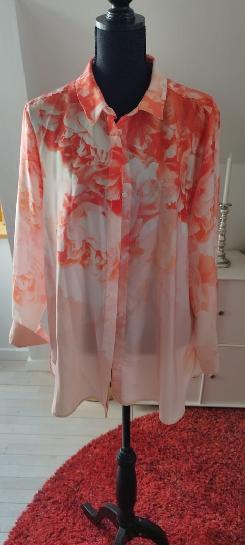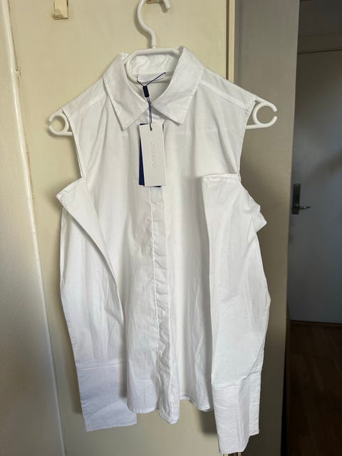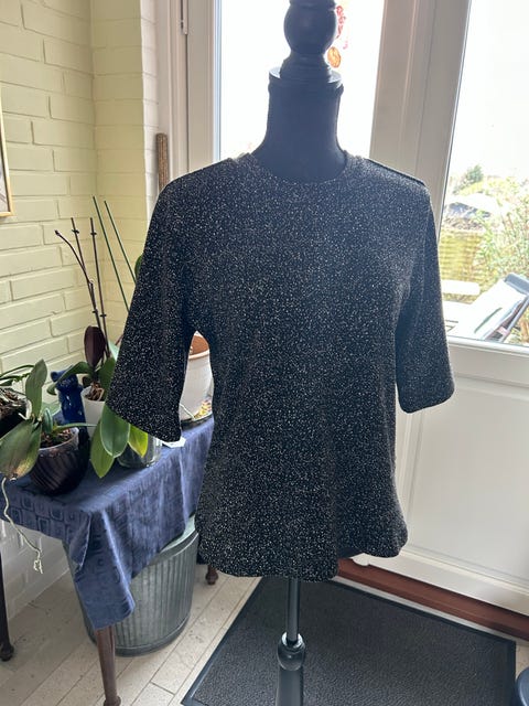Ny Flot MADS NØRGAARD bluse i blå og hvid med kort ærme, fleksibel stof, str. L.