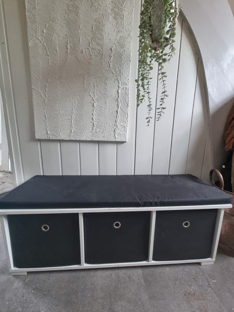 Bænk med kasser og pude