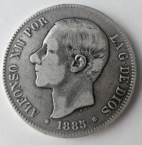 5 Pesetas sølvmønt fra 1885